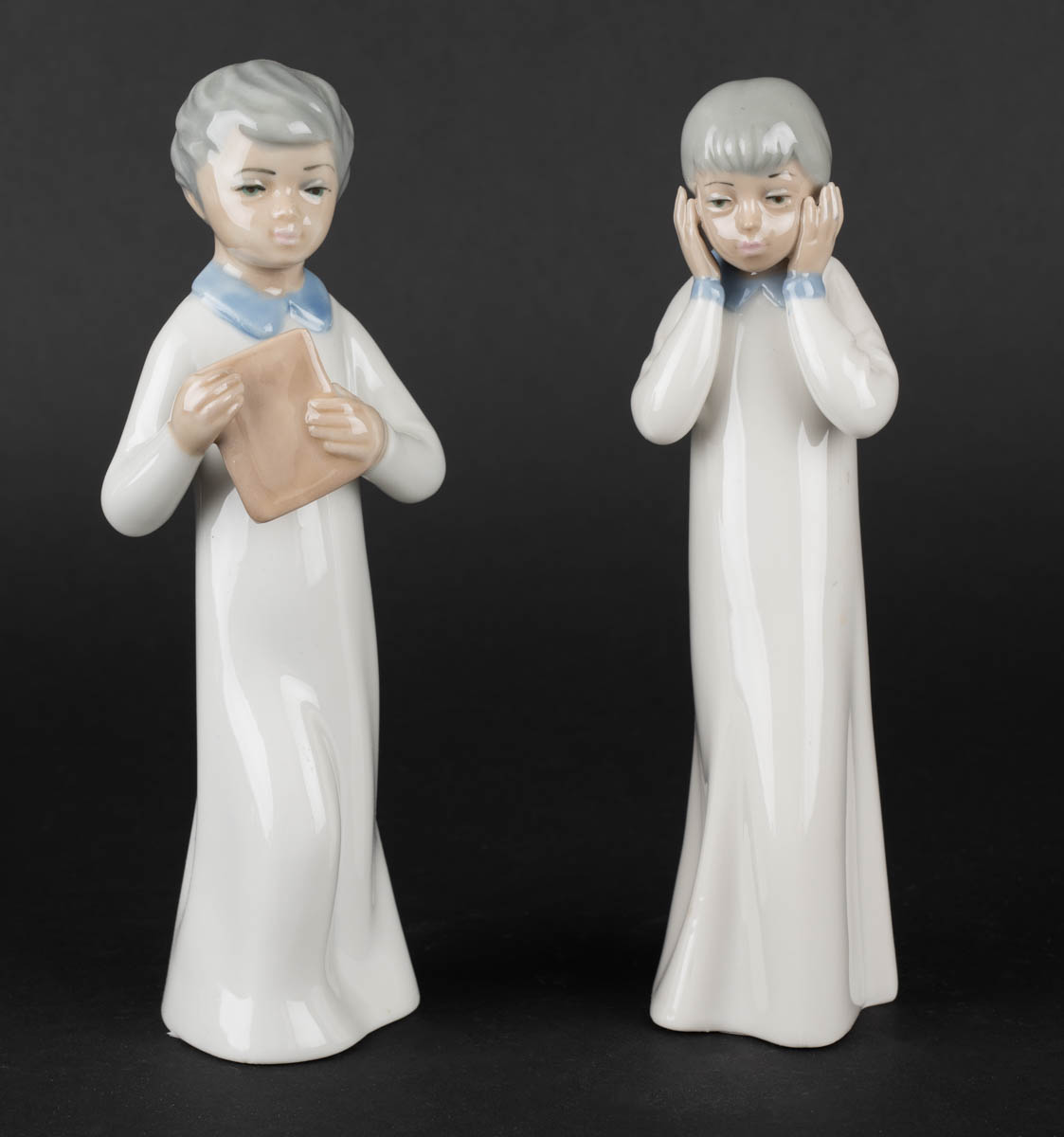 Tvö börn í náttkjólum - Postulín - Merkt. 21 x 9 cm og 20 x 6 cm