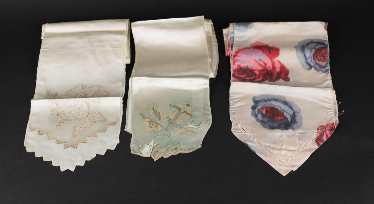 Þrjú slifsi, tvö ámáluð og eitt úr rósóttu efni - Textíll - Ómerkt. 20 x 140 cm, 16 x 140 cm, 18 x 140 cm