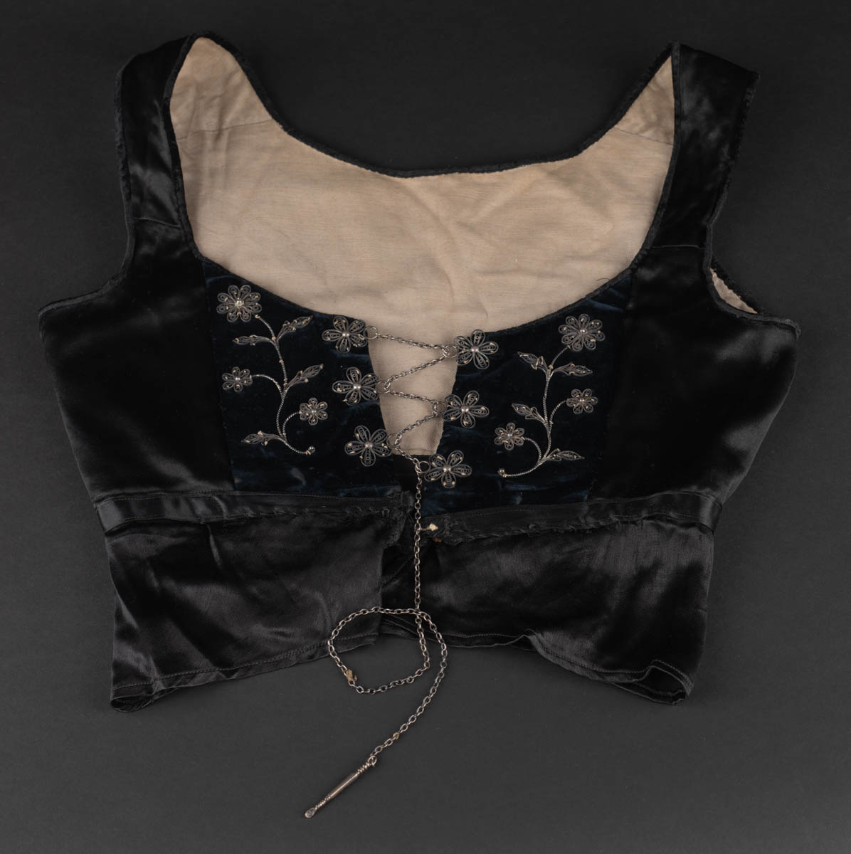 Upphlutur með borðarósum og sex millum á barmi - Satín, reim og nál - Textíll - Ómerkt. Mitti: 68 cm, Brjóstmál: 86 cm