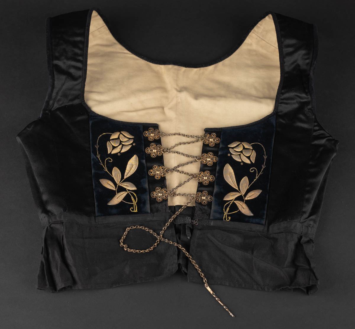 Upphlutur úr satín, 8 millur með reim og nál. Gullbalderaðir borðar, rós - Textíll - Ómerkt. Mitti: 70 cm, Brjóstmál: 84 cm
