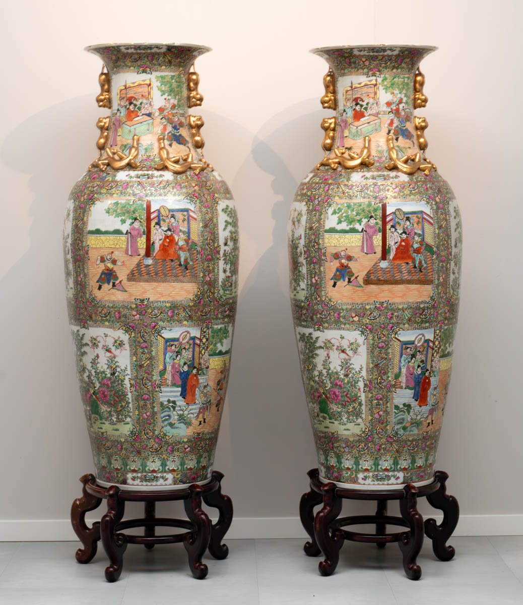 Tveir stórir kínverskir vasar, handmálaðir með gyllingu - Postulín - Ómerkt. 136 x 61 cm