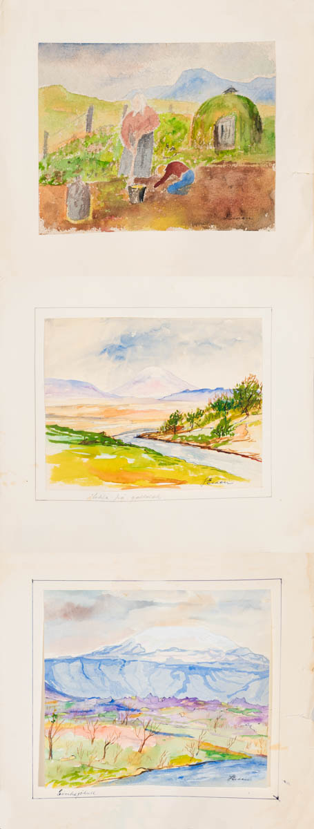 Sveitalíf - þrjár vatnslitamyndir, óinnrammaðar - Vatnslitir - Merkt. 18 x 23 cm