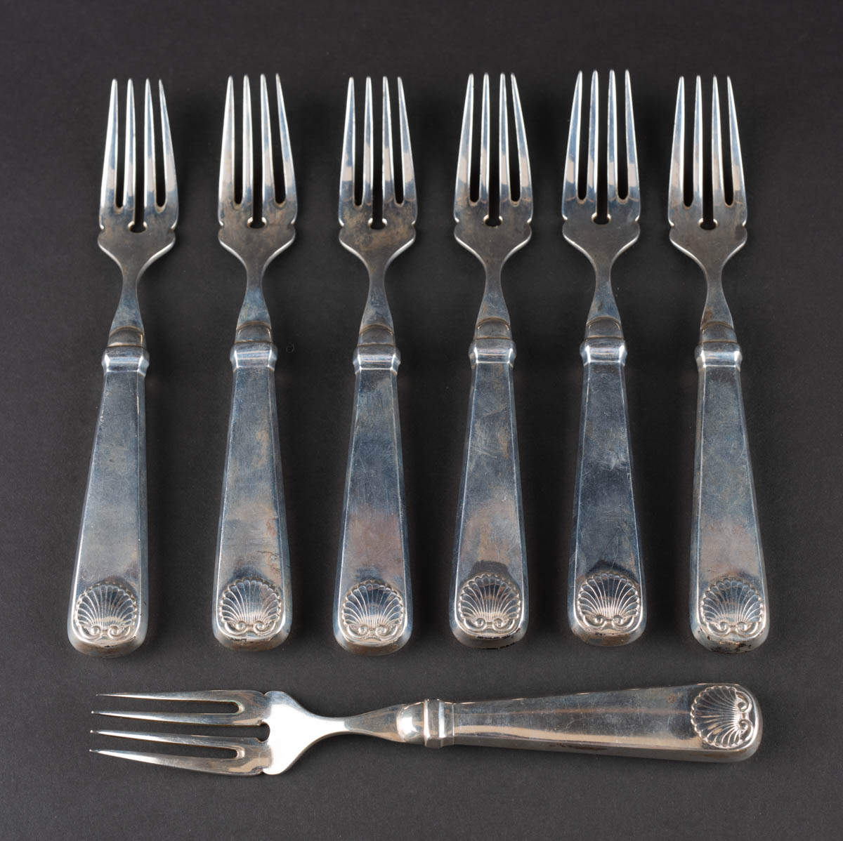 Sjö matgafflar - Silfur - 364 g. CFH. Merkt. 18 cm